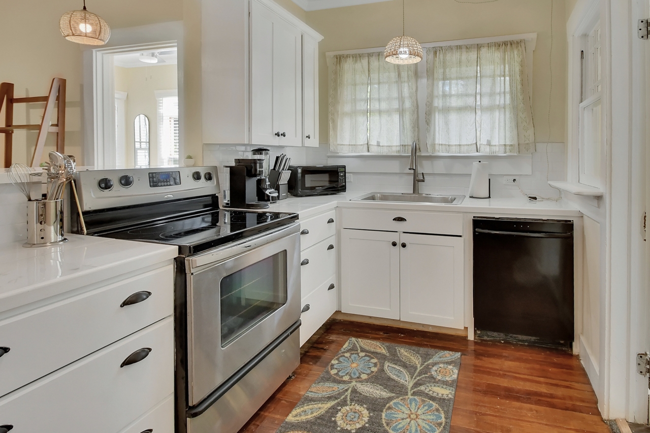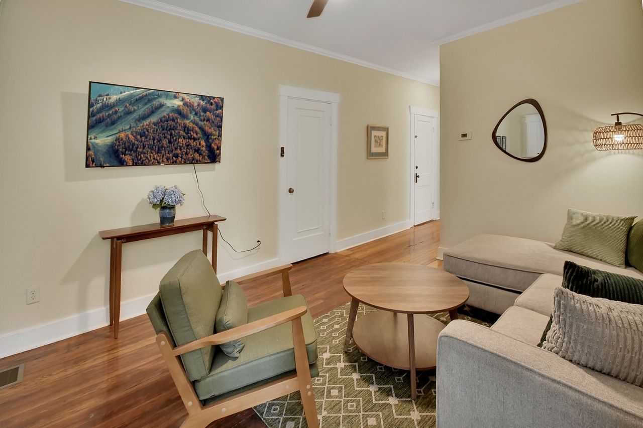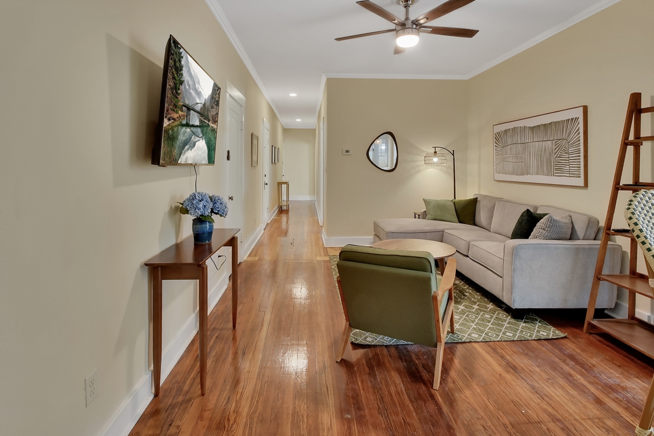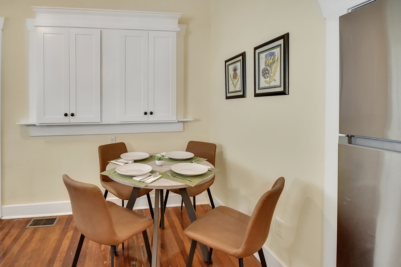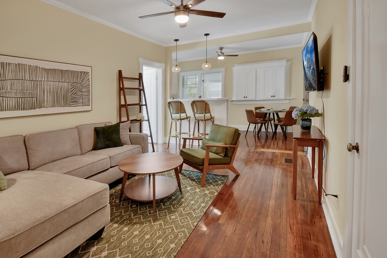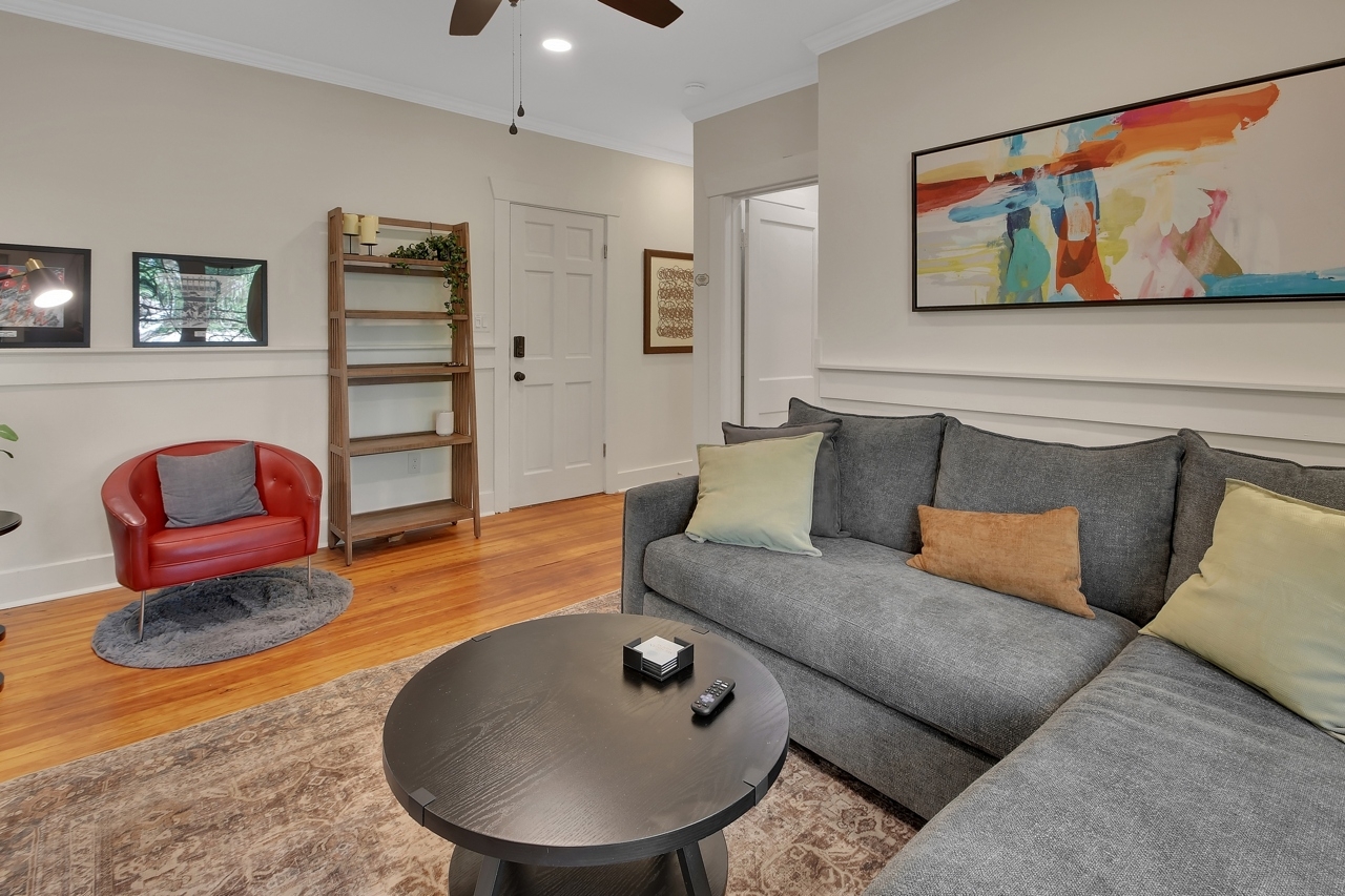 The Michigan House offers five distinct homes — two historic residences downstairs, two boutique flats upstairs, and a studio loft on the third floor — each thoughtfully designed with its own personality. High ceilings, tall original windows, and refinished heart pine floors create a consistent thread of comfort and character throughout. Restored wooden cabinetry and historic pattern tile add authenticity, while each space tells its own story. Every residence also includes a full kitchen for modern living.