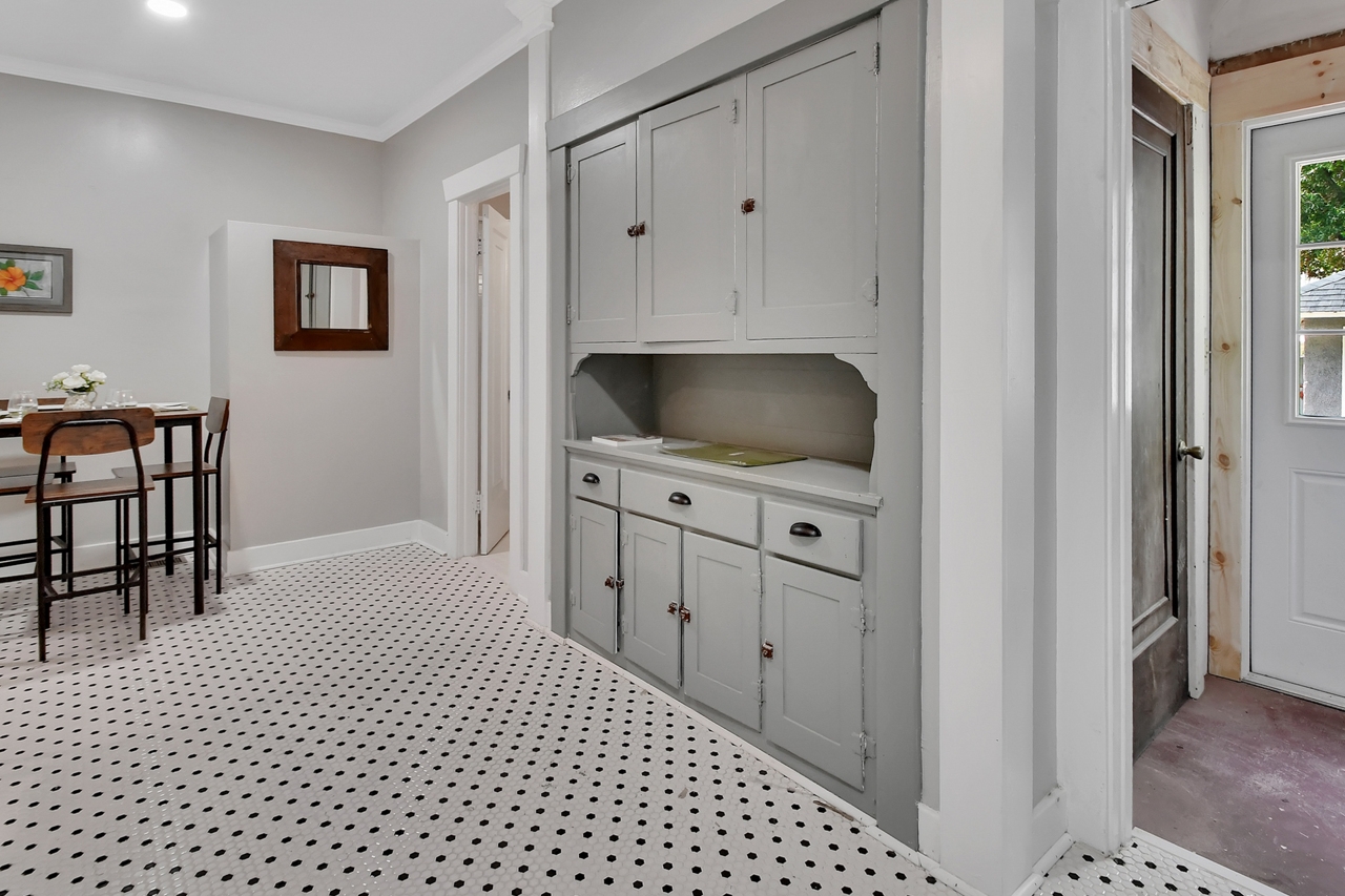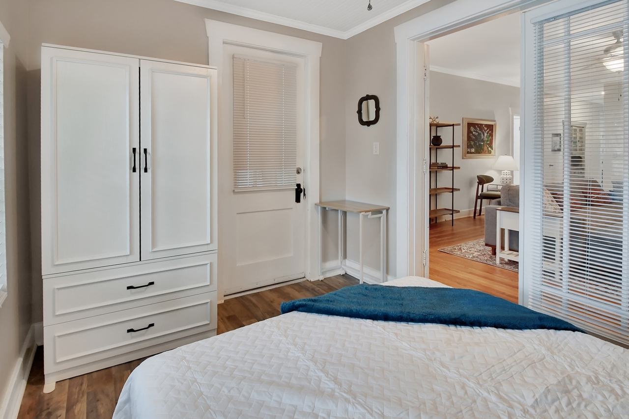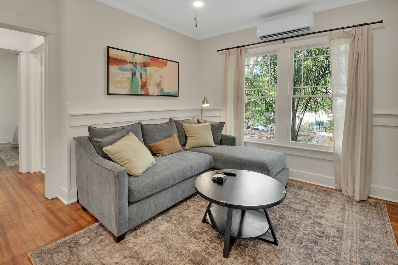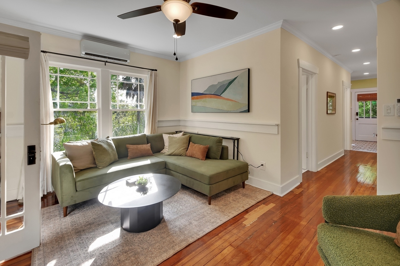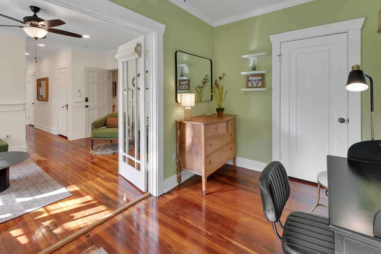 The Michigan House offers five distinct homes — two historic residences downstairs, two boutique flats upstairs, and a studio loft on the third floor — each thoughtfully designed with its own personality. High ceilings, tall original windows, and refinished heart pine floors create a consistent thread of comfort and character throughout. Restored wooden cabinetry and historic pattern tile add authenticity, while each space tells its own story. Every residence also includes a full kitchen for modern living.