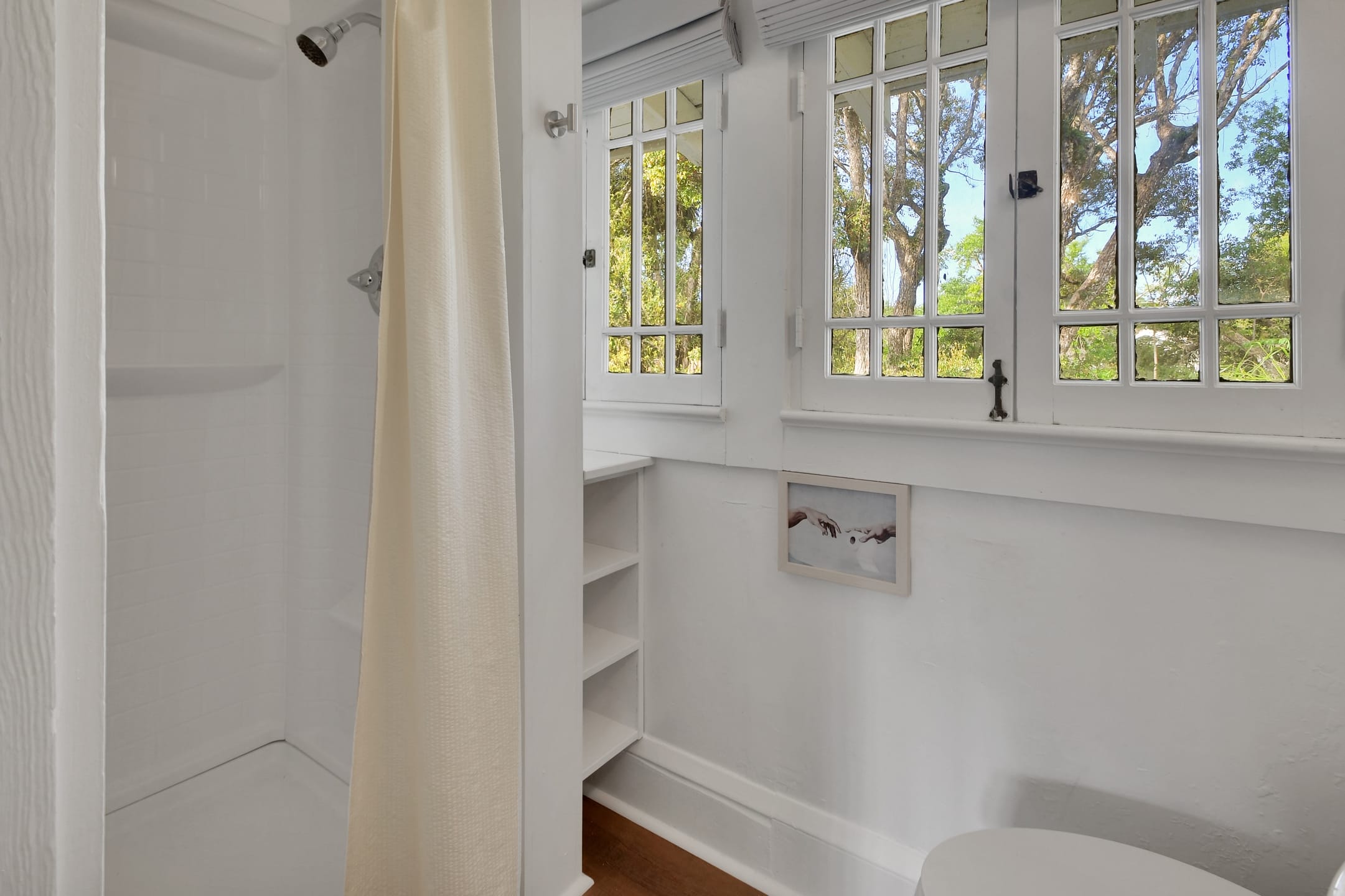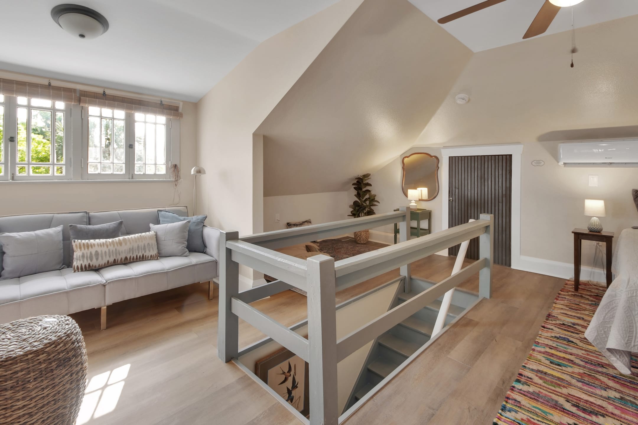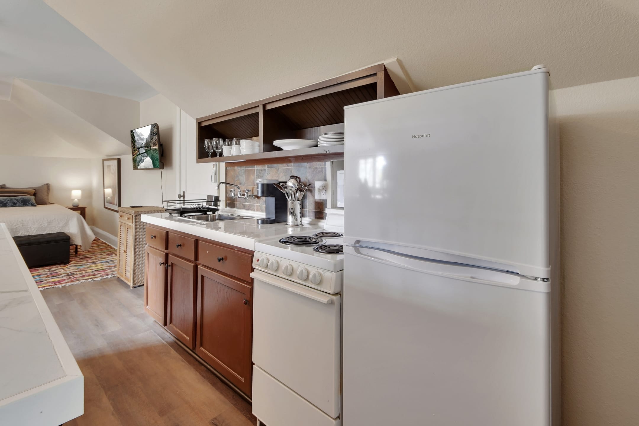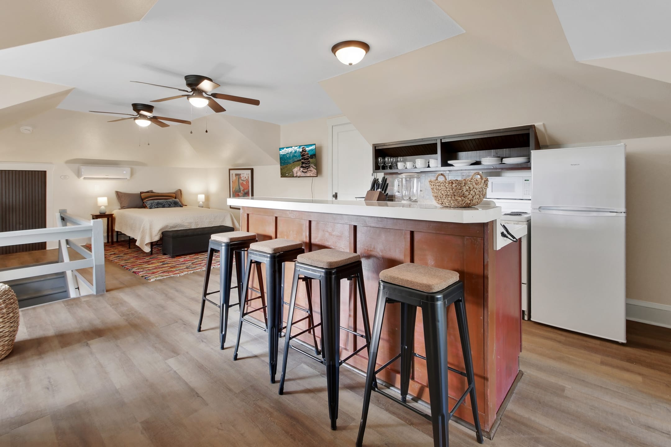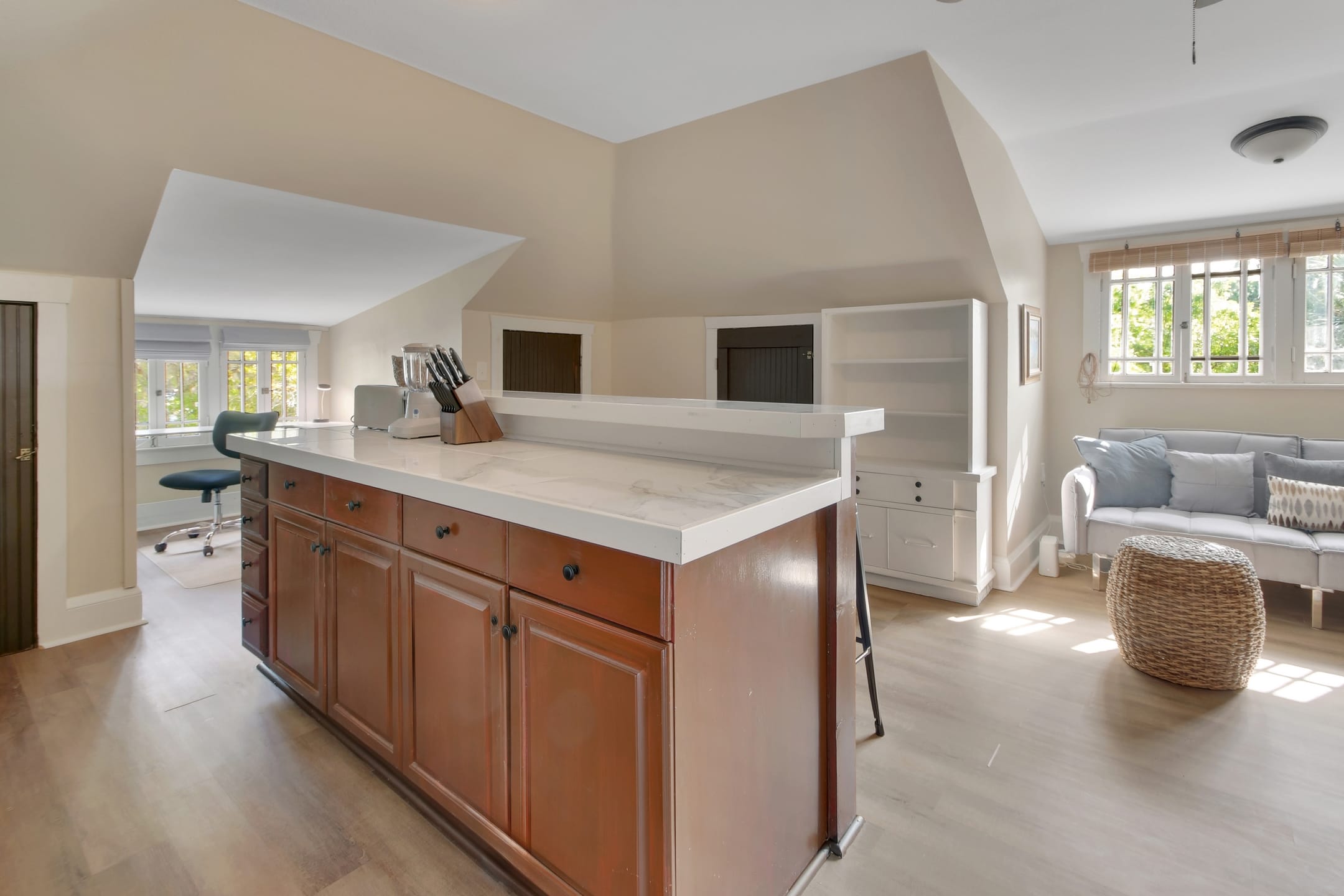 The Michigan House offers five distinct homes — two historic residences downstairs, two boutique flats upstairs, and a studio loft on the third floor — each thoughtfully designed with its own personality. High ceilings, tall original windows, and refinished heart pine floors create a consistent thread of comfort and character throughout. Restored wooden cabinetry and historic pattern tile add authenticity, while each space tells its own story. Every residence also includes a full kitchen for modern living.